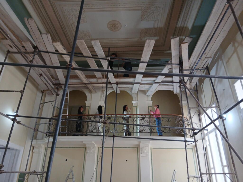 -Naša radionica izvodi restauratorsko-konzervatorske radove u Baroknoj sali prema prvobitnom izgledu iz 1905.godine. U startu smo se suočili sa problemima zbog prvobitne primene al seko tehnike na suvoj podlozi, usled čega se boja briše , kad se dodine četkom razmazuje, tako da smo bili prinuđeni podlogu najpre dobro pripremiti i nahraniti sa više nanosa takozvane magle, da se boja potom za nju dobro veže. Zatim nanosimo postojane, akrilne boje, pa tek onda pristupamo minucioznom slikarskom radu, izradi venaca, lajsni, oslikavanju svoda, objašnjava poznati mitrovački slikar Damir Savić, predstavljajući svoju desetočlanu ekipu slikara-restauratora.