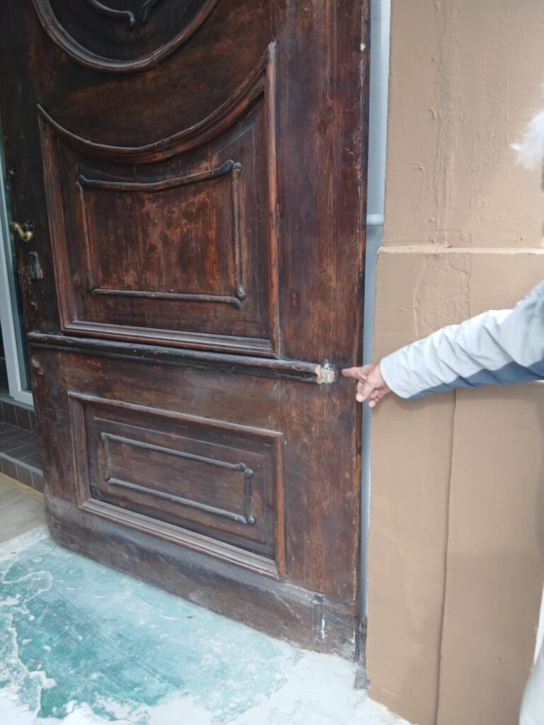 -Šokirani smo najnovijim u nizu nezakonitih postupaka zakupca Parohijskog doma naših predaka! Skoro dve godine nakon skandaloznog postavljanja PVC vrata na ajnfortu kuće Bajića, pre neki dan osvanula su stara, drvena vrata, ali u istom stanju u kakvom su i skinuta?! Koga oni blefiraju? Ovde nema R od restauracije!-ogorčen je Ilija Bajić, potomak čuvene mitrovačke porodice Bajić, pokazujući na desetine nedostataka stare kapije, na kojoj su golim okom vidljive pukotine, ogrebotine, nedostatak ornamentike, kao i brave na jednom krilu?!